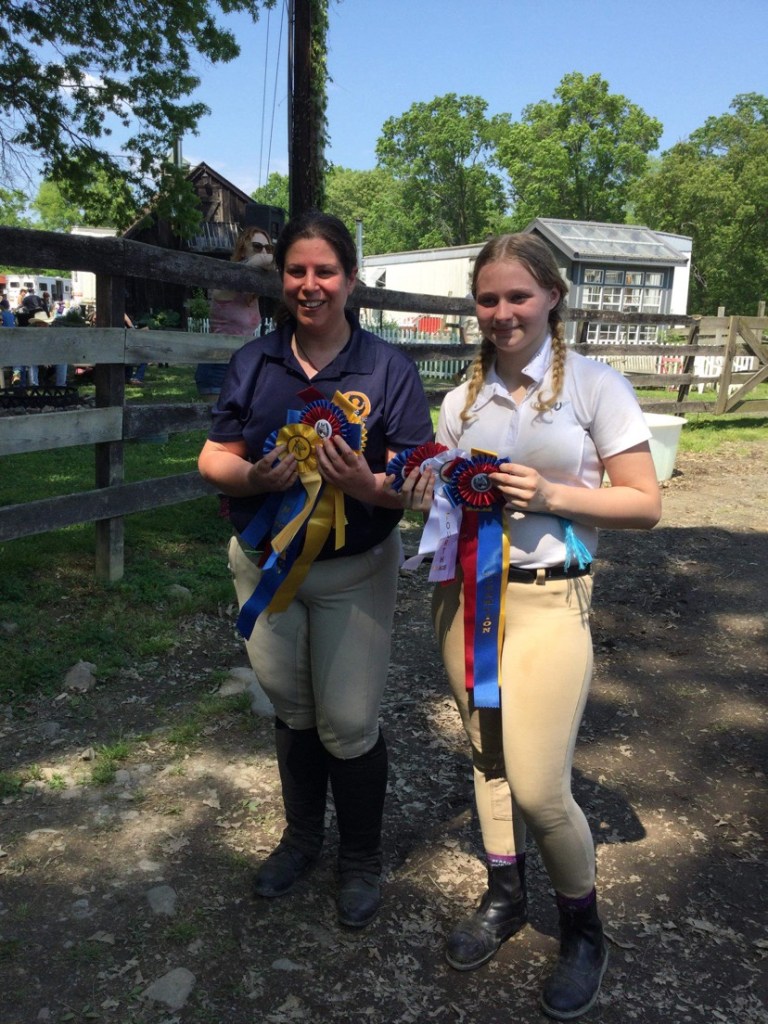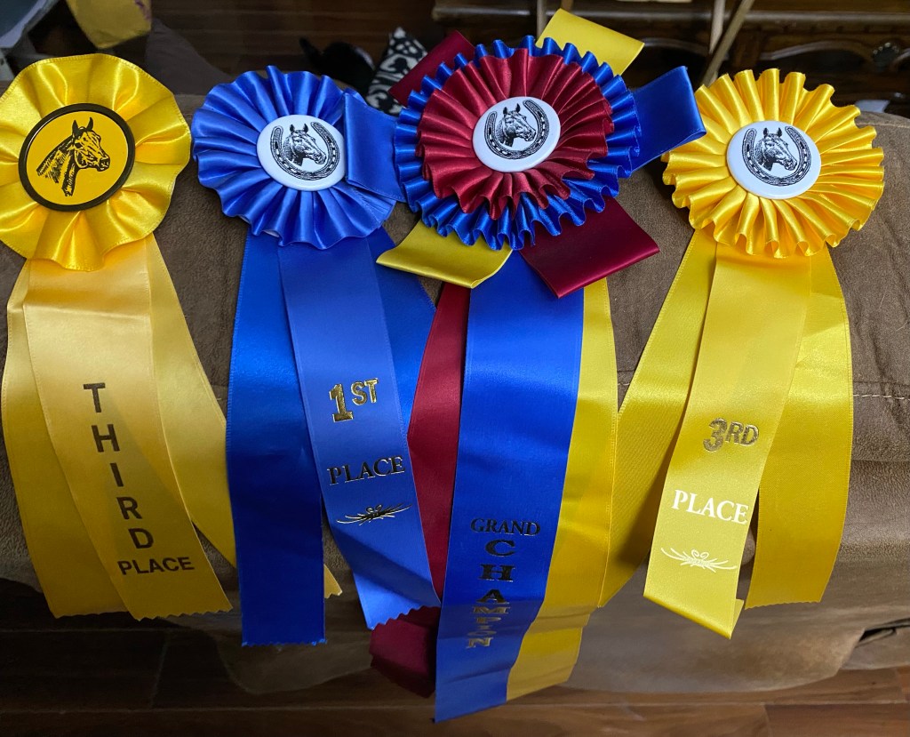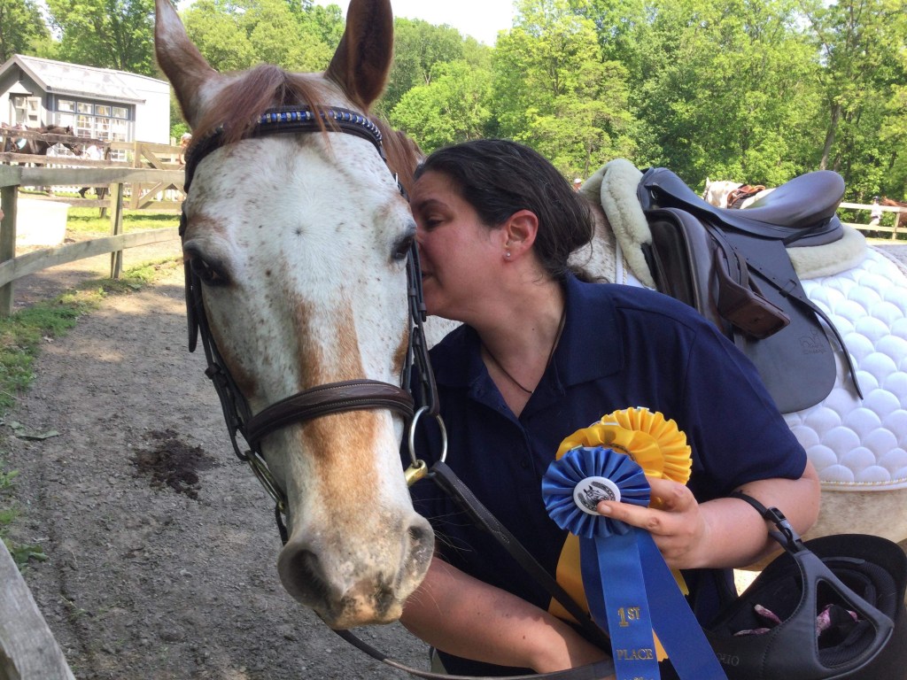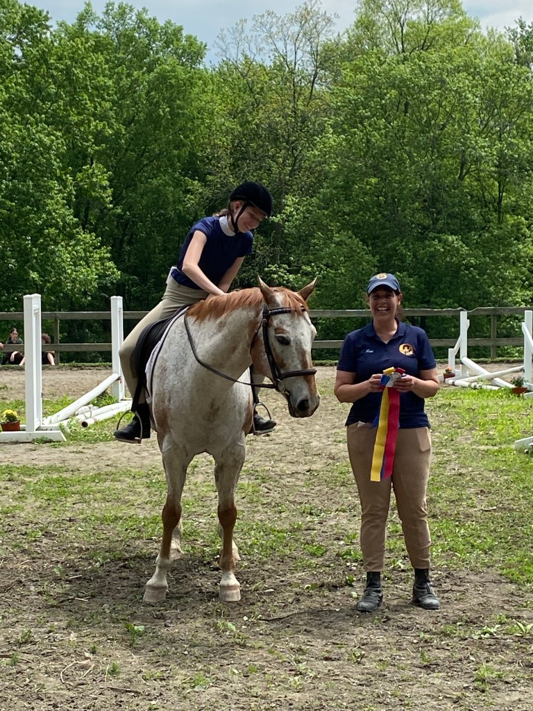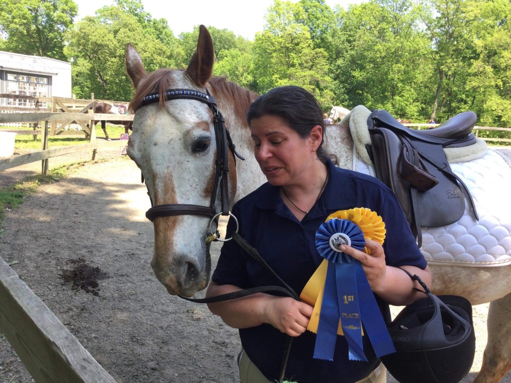 Now…the champion ribbon. I had literally no idea I won it. I had left the arena to un-tack Copper and was watching him finally drink some water when one of the other students from our barn came to me and said “Judy, I think you won champion”. I look at her and said nah, no way. She says “there was only one Judy in the class.” So I hand her Copper to hold and I head back towards the arena. Coming at me is Maddie, another rider from my barn, and in her hand is a champion ribbon. Then she tells me she got champion as well, we were tied.