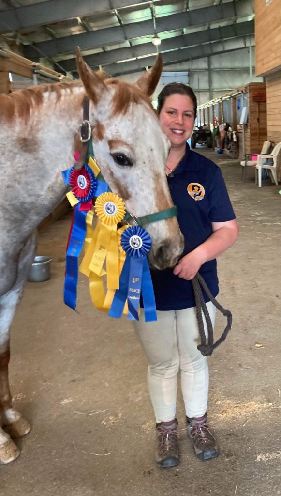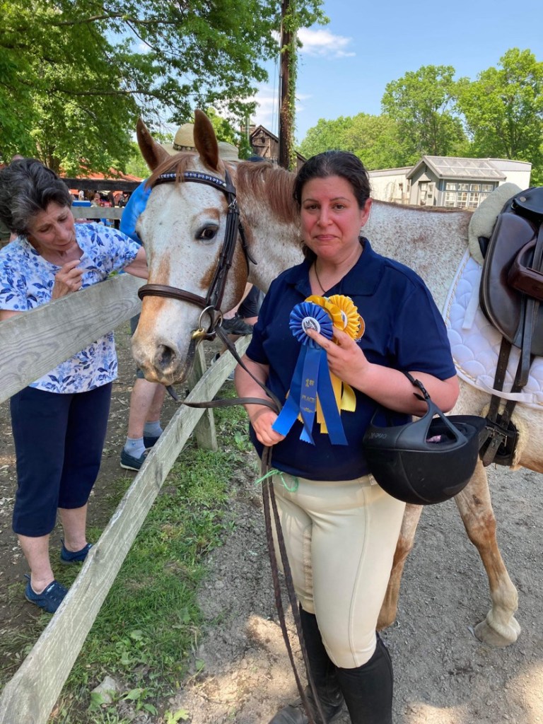 The horse show. Picture this everyone, May 22, 2022 – the normal temperature for the end of May in NY should be around the mid 70s, maybe low 80s. Well, yesterday the weather was 94 with high humidity and blazing sun. It was hot. Not warm, just plain hot. I’m not sure how much water I drank yesterday but at one point during my class, the judge announced that the rider on the pretty red and white horse needed water NOW. So everyone paused so I could have some water which I not only drank but poured down the front and back of my shirt. At this point, I truly didn’t care how much of a hot mess I looked like, I wasn’t about to pass out at my first show with my boy, who was absolutely perfect.