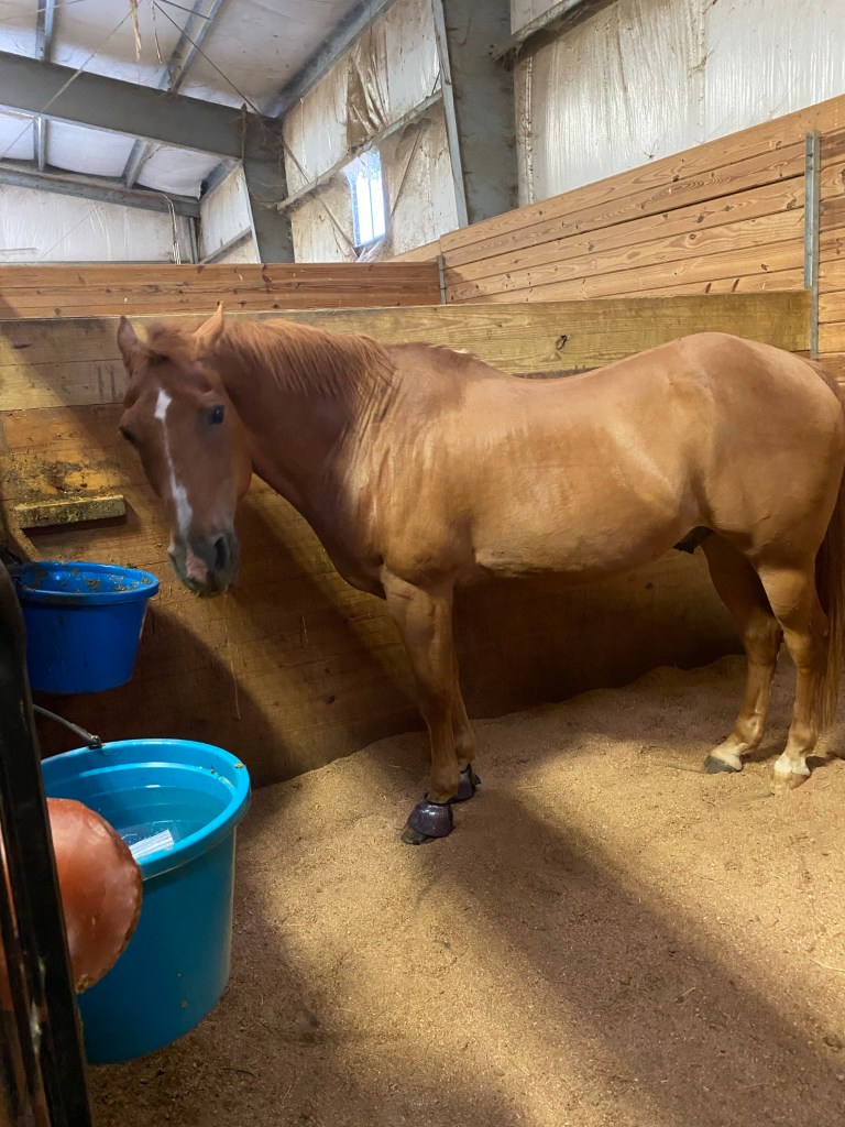 When the fitter arrived, she hadn’t seen Alfie in about a year. After she set up her work table and supplies I got Alfie out of his stall and walked him to the grooming stall. Because of COVID, the fitter, her assistant and myself were all wearing masks. As we walked by her she took one look at him and was stunned. She couldn’t believe how muscular he was. Through her mask I could see her mouth was open in shock. She asked what had changed. I told her consistent dressage lessons every weekend at his pace. I explained how I made the decision to keep doing lessons but only at a walk with some light trotting only in straight lines so as to not aggrevate his tendons or feet. I explained all I wanted to do was enjoy him for who he was, and to enjoy riding him for as long as possible.