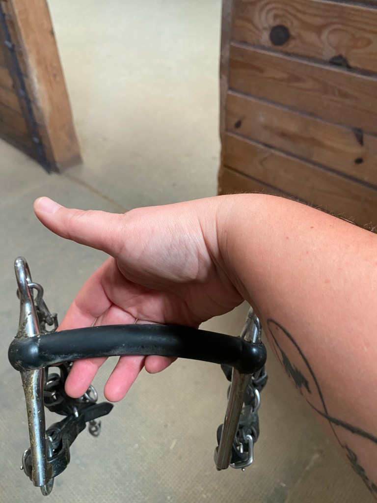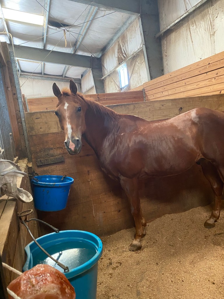 I get him all tacked up and Regina gets on him. I immediately can see that Alfie is much less stiff in his movements. He was forward, responded to Regina’s leg and seemed more willing to move today. She gets off and I get on, and he is much better than yesterday. I was able to get him to do some circle exercises in both directions which he did well with. He still seemed a little stiff in spots but overall he was better.