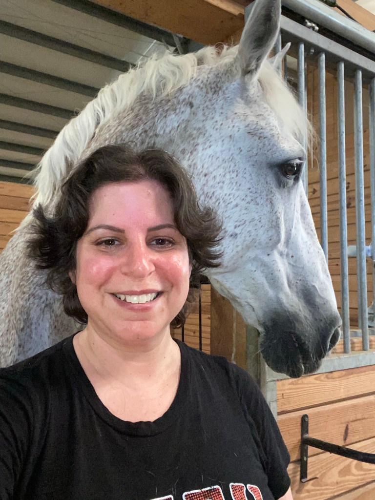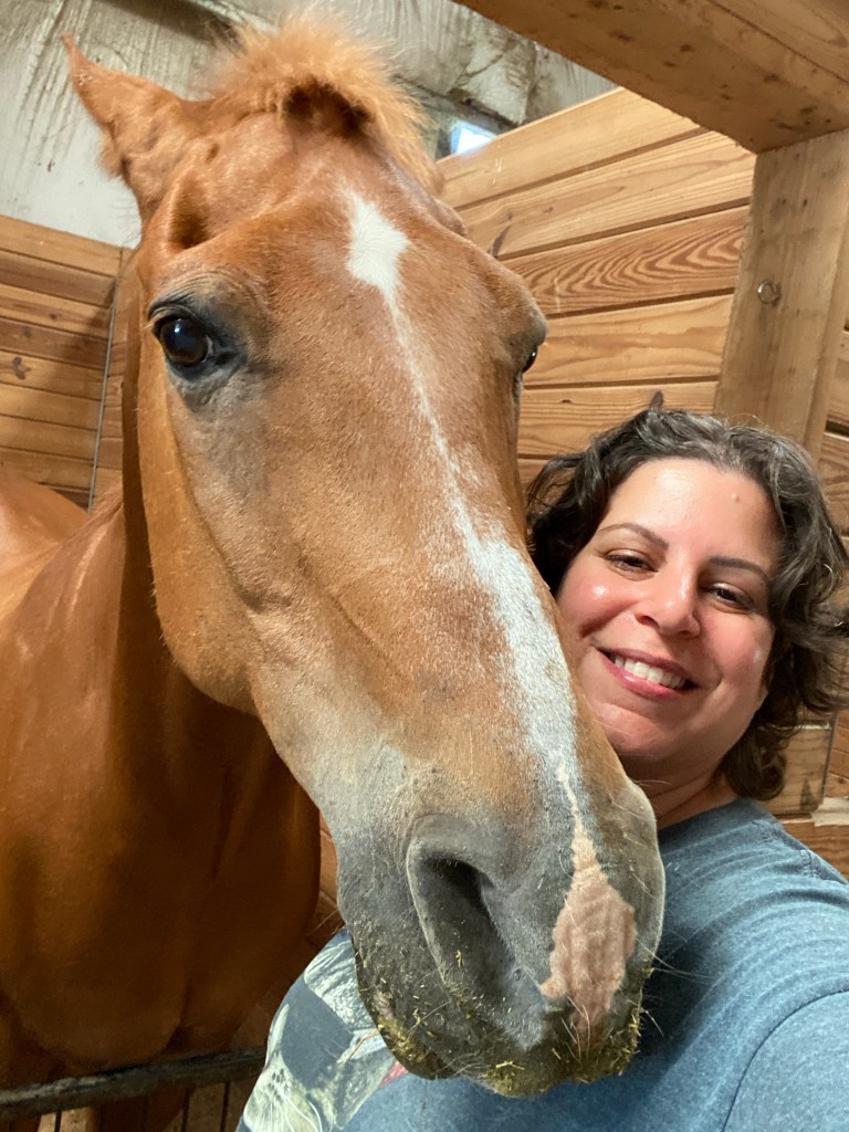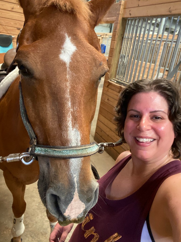 Fast forward about 33 years. I stumbled upon a Groupon for a discounted trail ride. So I signed up myself and my husband…my extremely allergic husband (didn’t realize his allergy was going to be a severe one) for this trail ride. Despite my husband breaking out into hives and needing 2 doses of Benadryl, we both enjoyed it. And that was it, I was hooked. I started taking lessons at a stable that was much closer to me than where we had the trail ride and 4 months into lessons, I bought my Alfie.