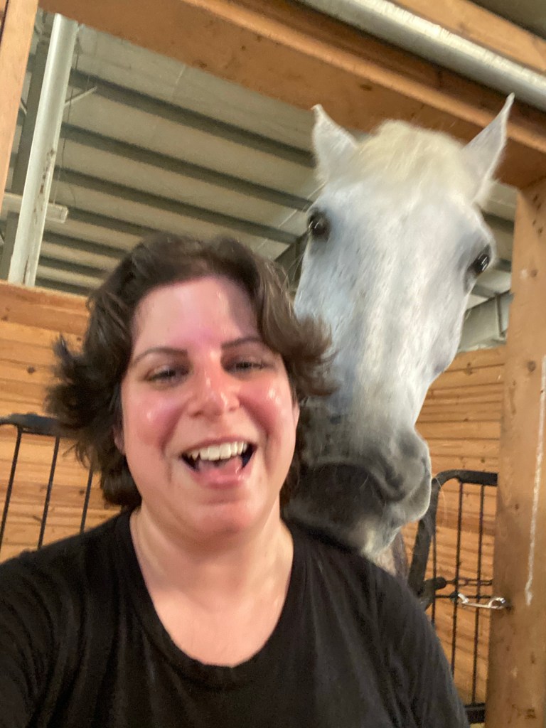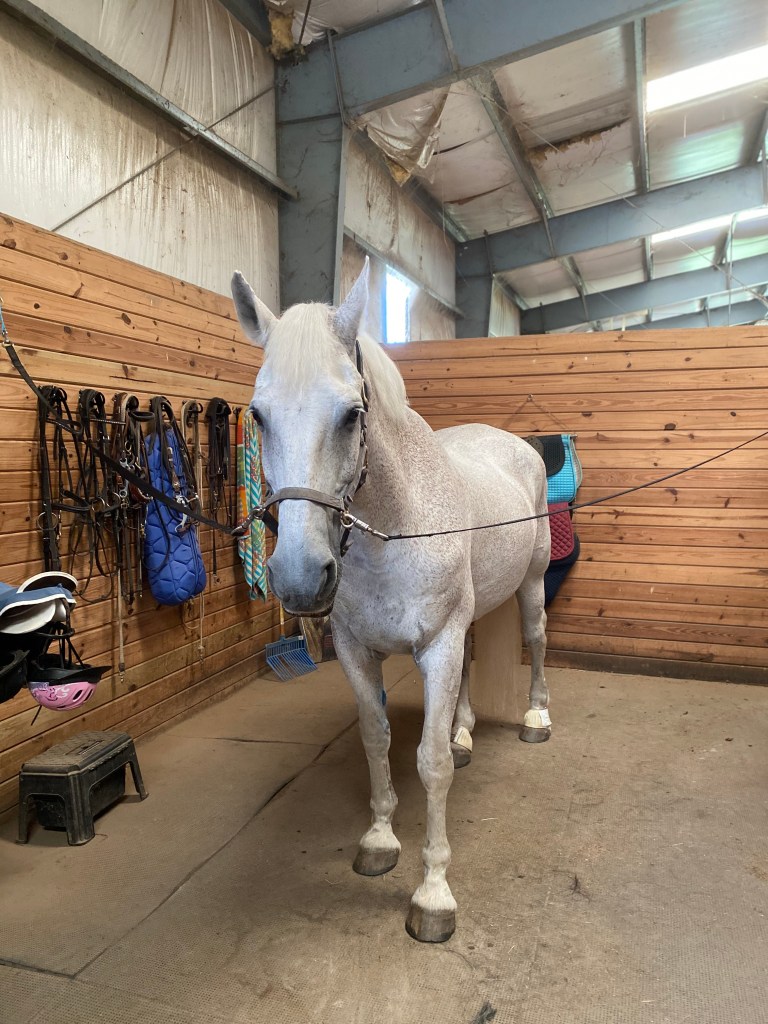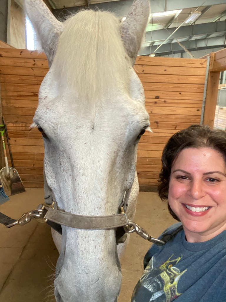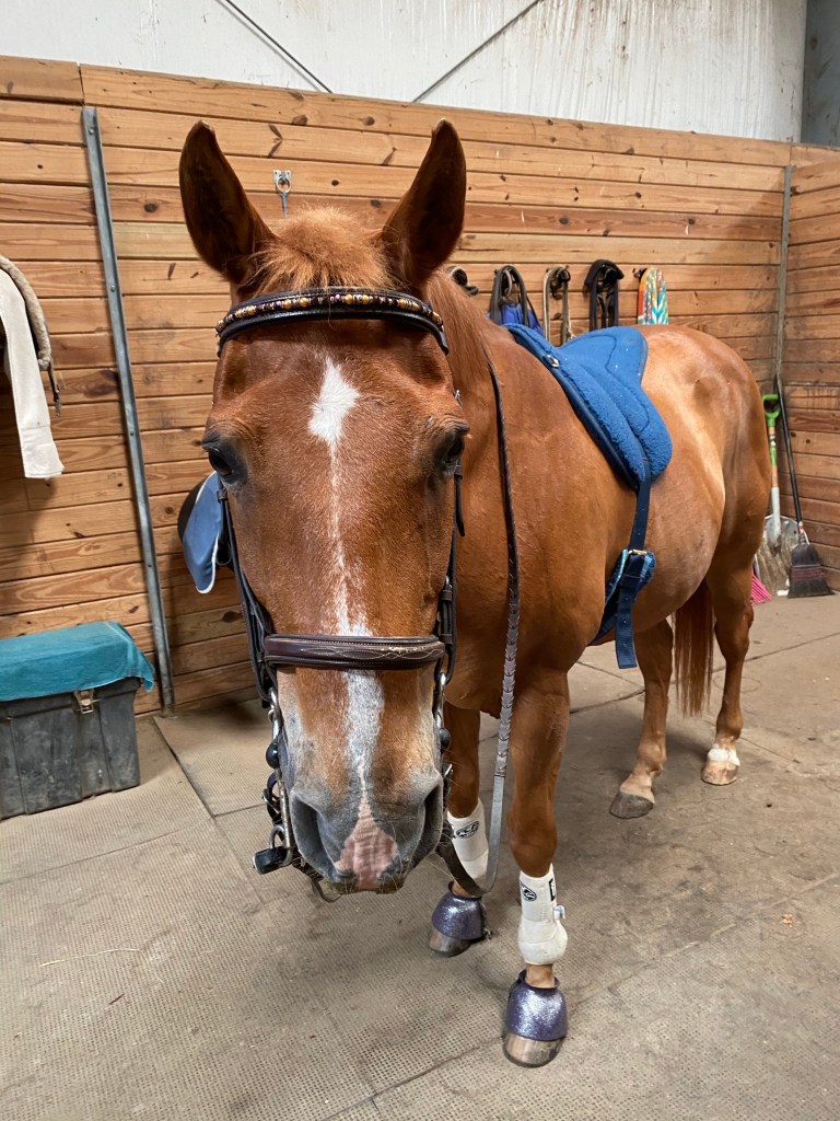I wipe down Alfie and get him all tacked up for our lesson. We head towards the mounting block, he’s lined up nicely, I climb 2 steps and sure enough, he swings his ass away. So I climb down the block and I do the exercise I learned last weekend. I take my dressage whip and tap him on his side so he moves his butt over. I tap him a second time and now he is lined up at the block. I back him up a few steps and then climb back up the block. I grab the reins and I’m about to get on when he picks up his head and I can just tell he’s about to take a step. So I tell him in the nicest of firm voices “ugh ugh don’t do it.” And he changed his mind about moving and I was able to get on. Score a point for Judy. 😊