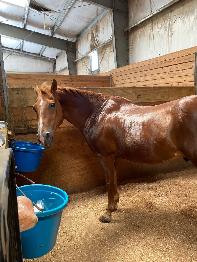 After our lesson, I bring Martini into the wash stall to give him a quick rinse, I put him in his stall and it’s dinner time. A wonderful way to end my Tuesday. ❤️🐴