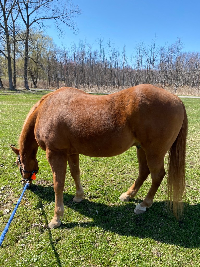 So, I got off and my trainer Kari got on, to see what the issue was. Well, the issue is me as well as the saddle. The saddle we are using for Copper fits him but not the best. Our saddle fitter is coming next month and Iām hoping she can re-flock my saddle (basically readjust the padding) so that it will fit Copper. So between my wonky hip and a saddle that hasnāt been properly fitted to him, itās giving him the wrong cues. While sheās riding him around in his hard direction at a trot, he picks up the canter. Itās beautiful. Kari is smiling and my heart just explodes to see this lovely canter.